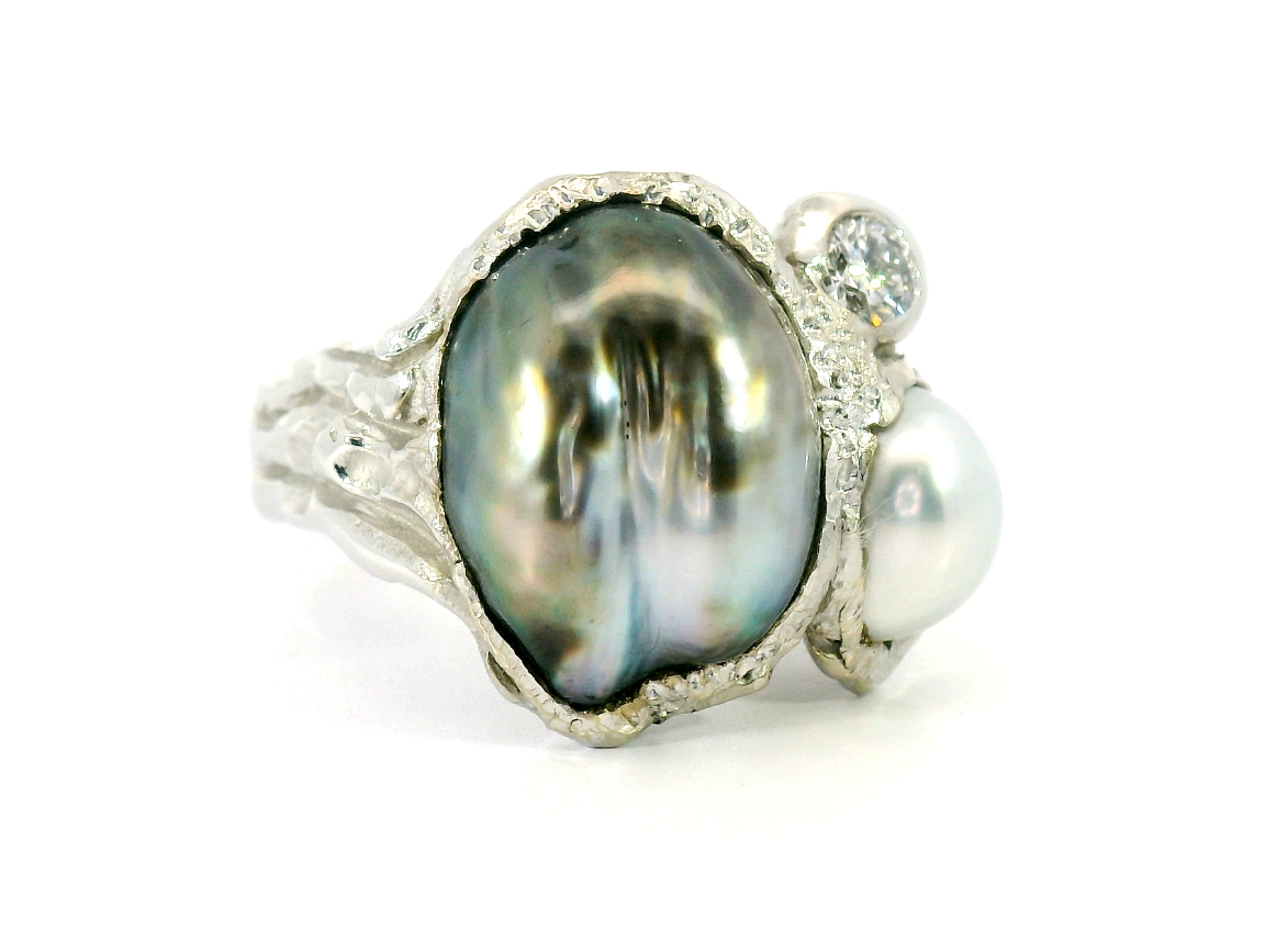 Золотое кольцо с жемчугом барокко и бриллиантом 0.20ct — настоящее произведение искусства, в котором воплощено не только мастерство ювелира, но и актуальные тренды. Это доказательство вашего изысканного вкуса, высокого статуса и яркий акцент в стильном образе. Вставка — 1 черный жемчуг барокко 14.80*11.35 мм, 1 белый жемчуг барокко 8.15*6.70 мм, 1 бриллиант круглой огранки 0.20ct 3/3, а обрамлением служит золото 750 пробы. Такое сочетание отлично смотрится и позволяет реализовывать самые необычные задумки вашего стиля. Размер ювелирного изделия — 17, а общий вес — 15.26 г, и на пальце оно выглядит просто шикарно, сразу привлекая восхищенное внимание.