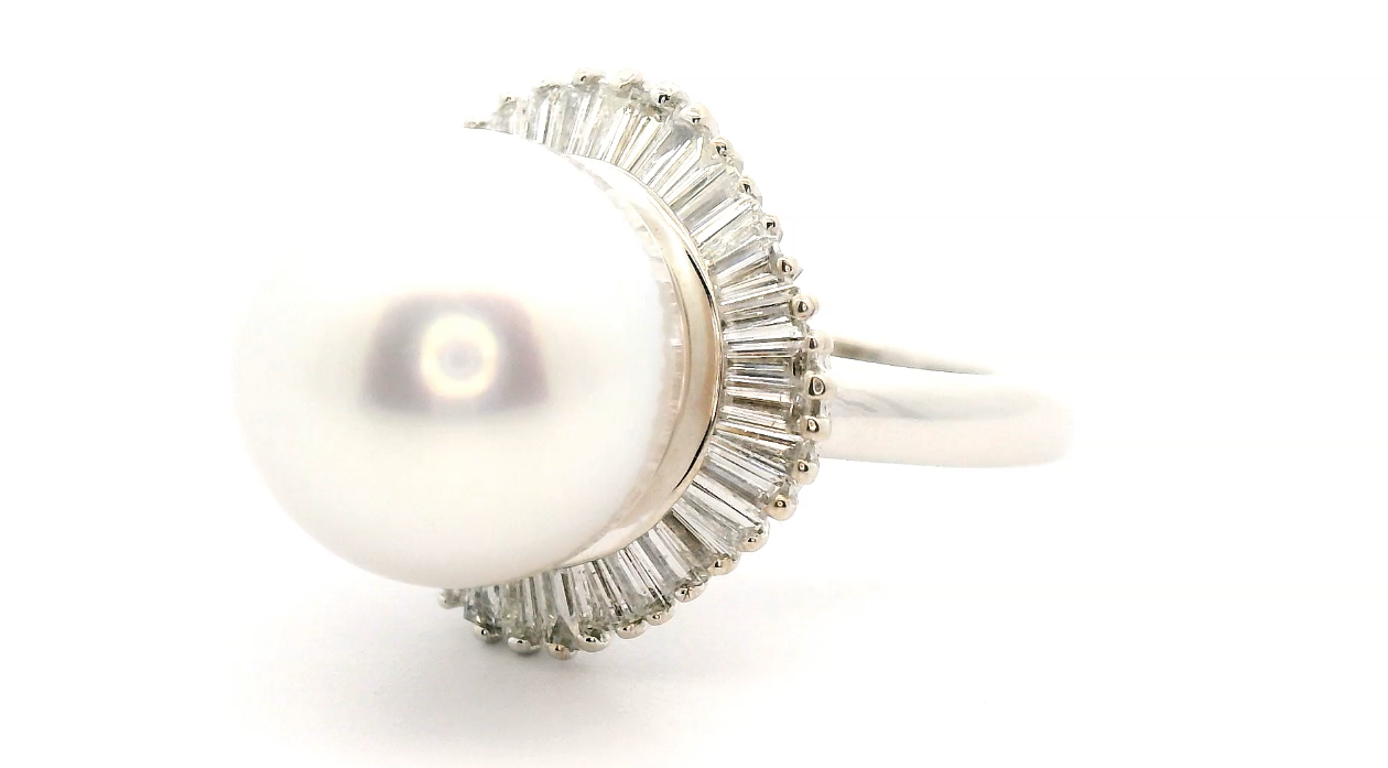 Золотое кольцо с жемчугом и бриллиантами 0.76ct — настоящее произведение искусства, в котором воплощено не только мастерство ювелира, но и актуальные тренды. Это доказательство вашего изысканного вкуса, высокого статуса и яркий акцент в стильном образе. Вставка — 1 жемчуг 11.60 мм, 36 бриллиантов огранки "багет трапециевидный" 0.76ct 3/3-3/4, а обрамлением служит золото 750 пробы. Такое сочетание отлично смотрится и позволяет реализовывать самые необычные задумки вашего стиля. Размер ювелирного изделия — 16.5, бесплатно изменим на любой от 15.5 до 17.5, а общий вес — 6.46 г, и на пальце оно выглядит просто шикарно, сразу привлекая восхищенное внимание.