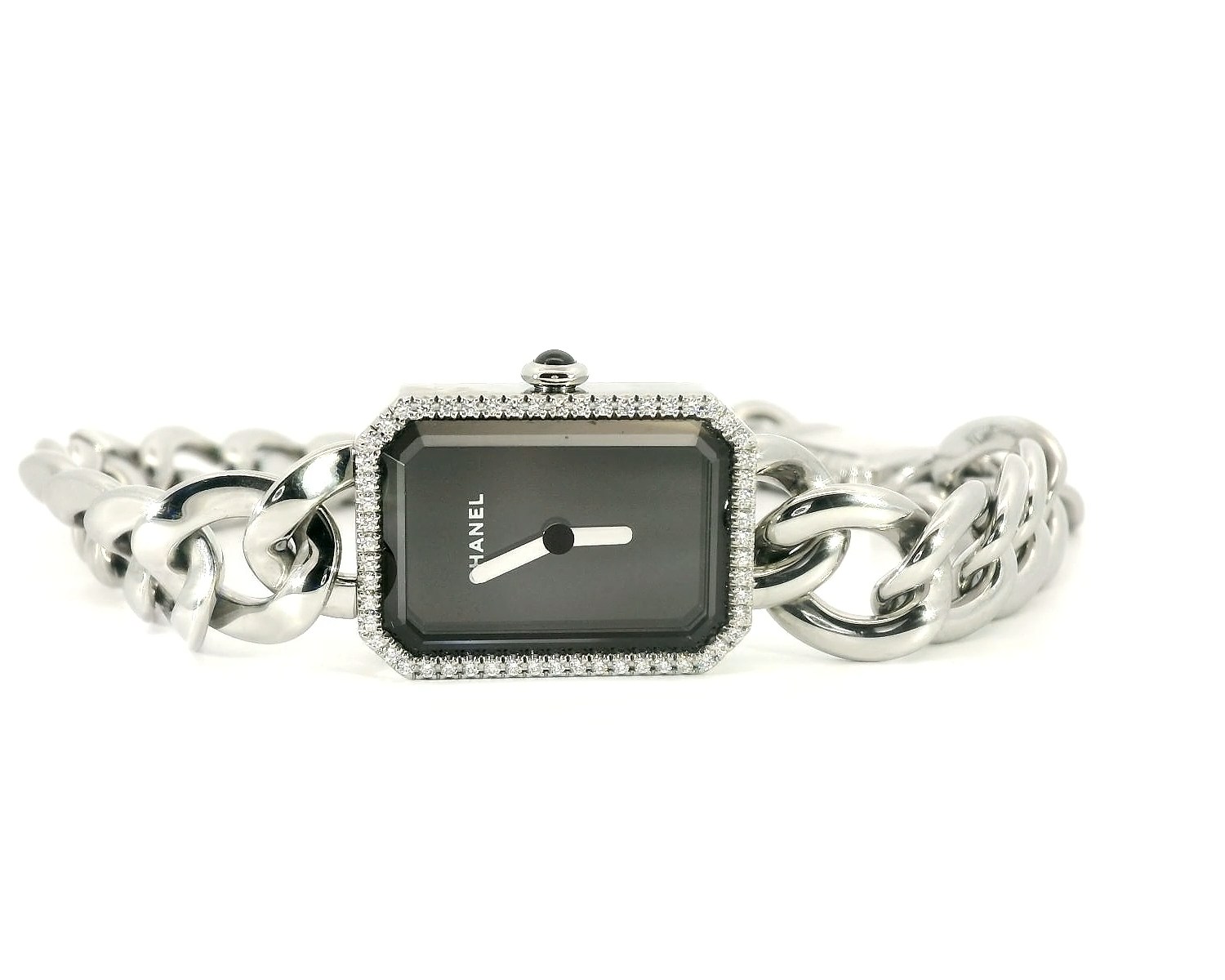 Представляем вашему вниманию оригинальные стальные часы с бриллиантами 0.18ct и черным ониксом 0.05ct от всемирно известного бренда Chanel из коллекции Première Gourmette Chain.
